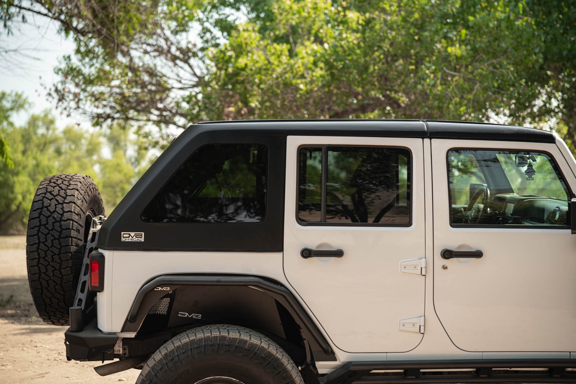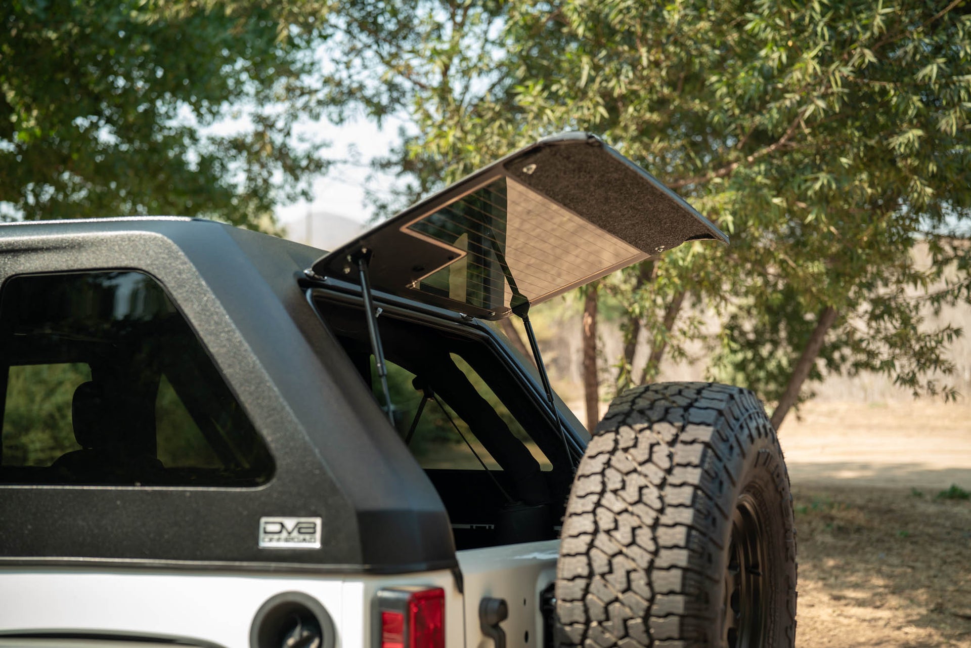 Our Jeep JK Fastback Hard Top features a high-quality fiberglass construction and insulated design for the perfect upgrade to your off-road build. The hard top offers durable rubber seals for preventing dirt and sand from getting caught between your Jeep and the top, while also preventing water from seeping inside. The fully carpeted interior not only provides a nice finishing touch, but it also serves as a barrier from outside temperature differences. Additionally, the top features a UV stable gel coat and tinted windows for maximum insulation. All DV8 tops provide a 2-piece design, so the part over the front driver and passenger lifts off like a Targa top. The rear window features durable hinges for full accessibility to your rear cargo space. The fully bolt-on mounting process and quick release latching system allows for a straightforward install and easy removal when you want to detach the top on a whim. Our top’s aerodynamic design minimizes wind noise and resistance for a quiet ride. Our Wrangler Hard Top is assembled in the USA.
