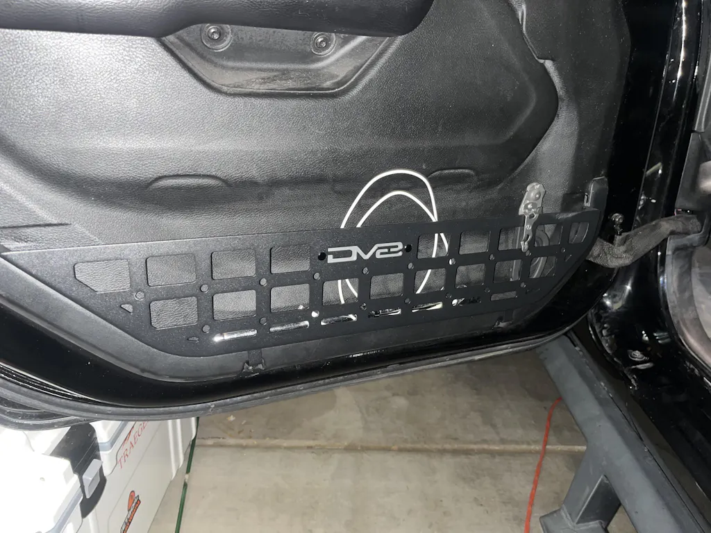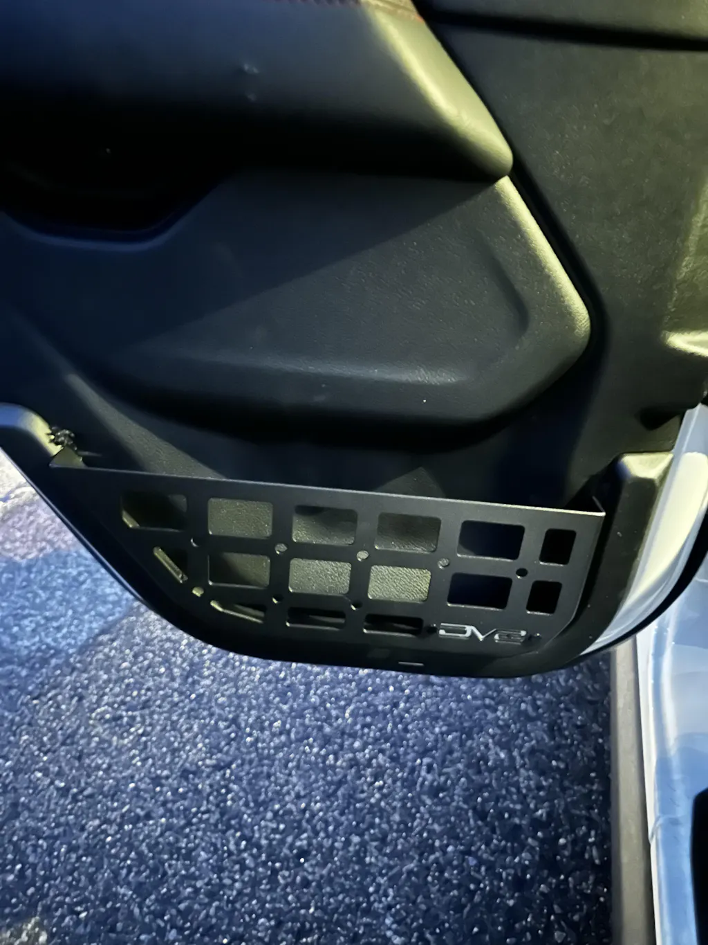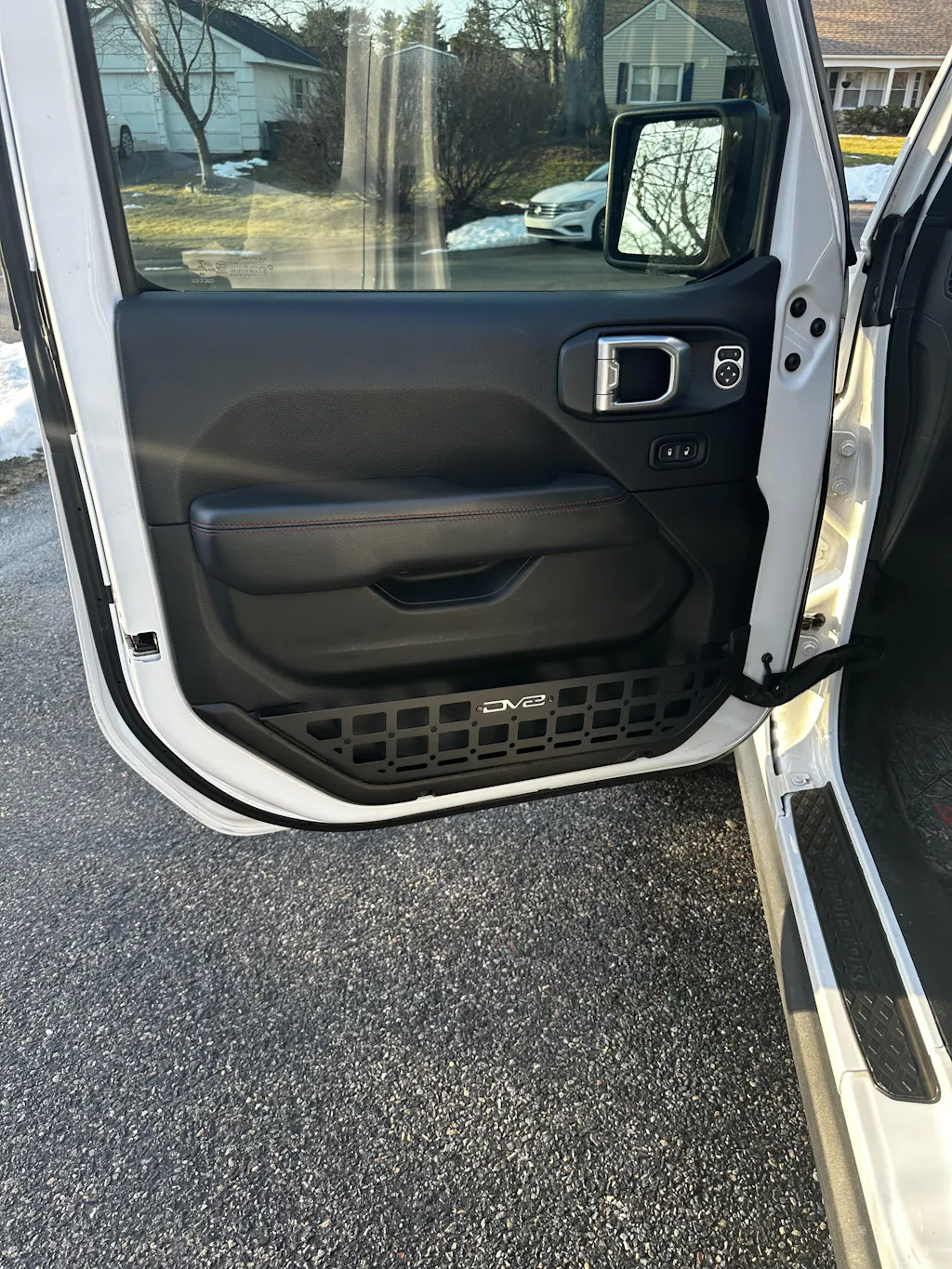 Our Jeep JT and JL Slim Front Door Molle Pockets easily replace the weak factory netting with rigid high-quality steel pockets that will keep your gear and accessories secure. Utilize the molle design to mount pouches, holsters, multi-tools, med kits, sheaths, and other daily gear while storing additional items inside the pockets. For improved legroom, they are slimmer than our standard Front Door Molle Pockets (MPJL-05). The snap in design with locking tabs easily secures the pockets into place for a quick and simple install process. The resilient micro-texture black powder coat adds a sleek finish that maintains your Jeep’s factory styling.