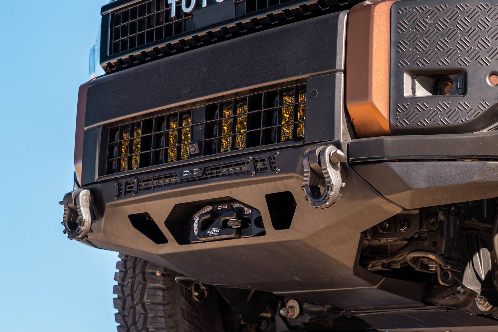 Built around a hidden winch mount that accepts a variety of winch sizes (up to 20.9” x 6.3” x 10”), it’s ready for serious recovery work. It features several lighting options, with a 20” center light bar mount, dual 3” pod light mounts in the side pods, and four elongated top slots designed for lights positioned behind the factory bumper mesh.