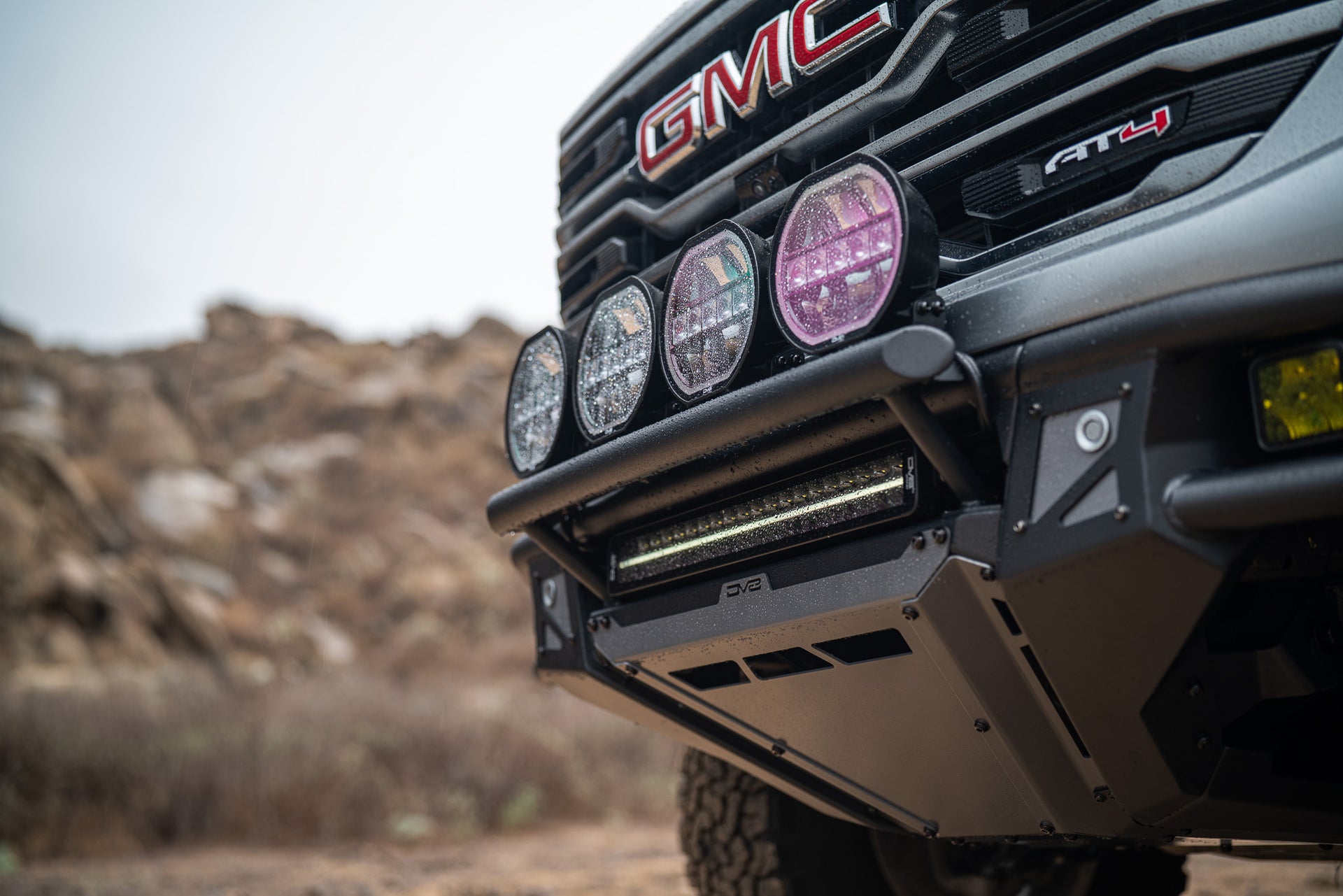 Our Tube Front Bumper for the 2022-2025 GMC Sierra 1500 is engineered with a focus on high clearance, utility & off-road styling. The center section supports either a 20-inch dual-row light bar or up to six 3-inch pod lights. Each bumper wing accepts two 3-inch pod lights per side, and the optional push bar provides additional mounting options for a 20-inch single or dual row light bar, or four 7-inch round lights, or eight 3-inch pods.