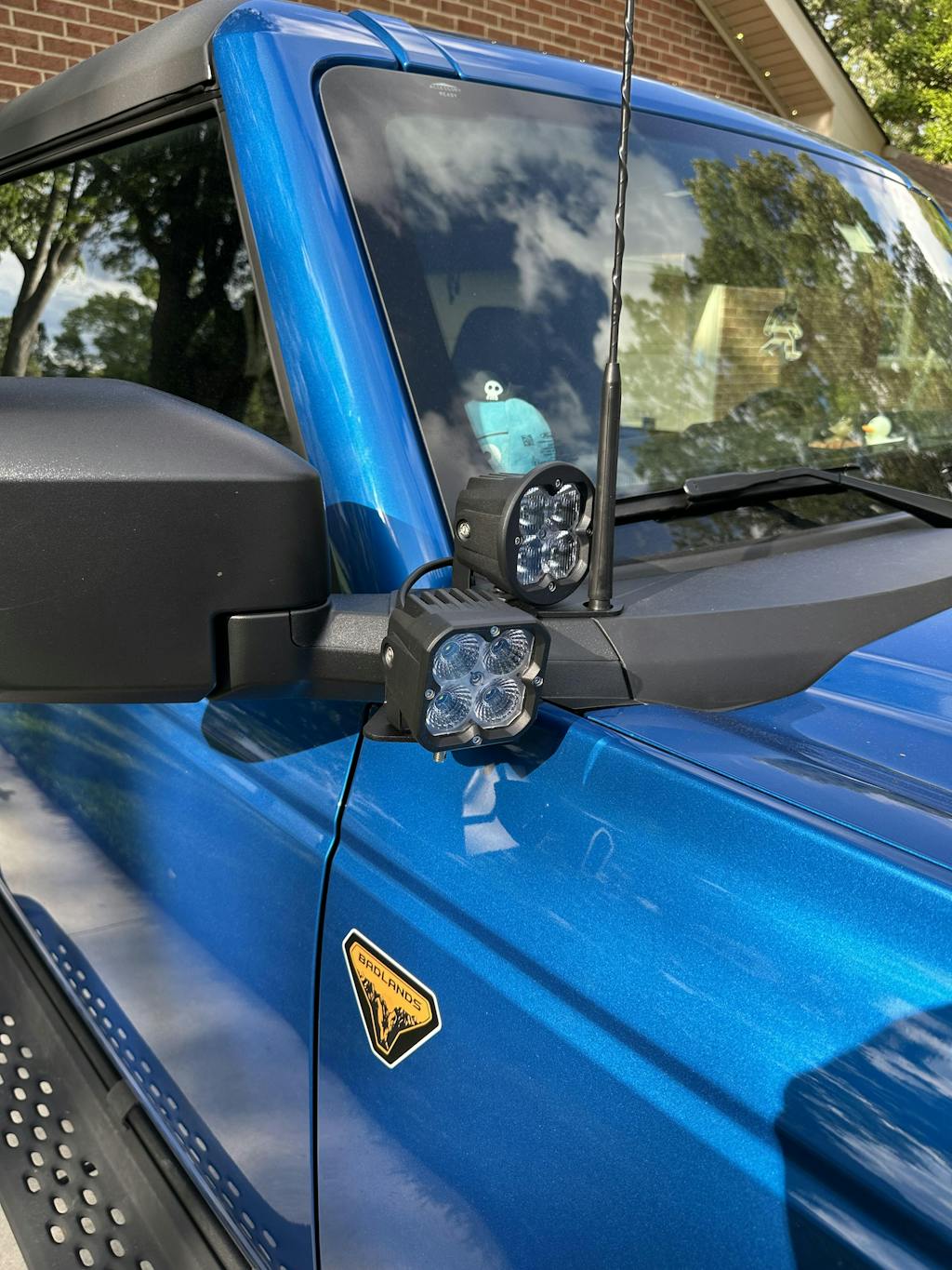 Our 6th Gen Bronco A-Pillar Dual Light Pod Drop Mounts provides options to mount (2) 3-inch light pods on each side of the Bronco. The top light mounting point is perfect for forward-facing or angled lighting. The drop mounting point is great for either forward-facing or side ditch lighting - perfect for dark trail conditions. The brackets sit in a low-profile position to keep the pod lights out of your sightline. Each side has provisions for mounting an antenna or whip flag.