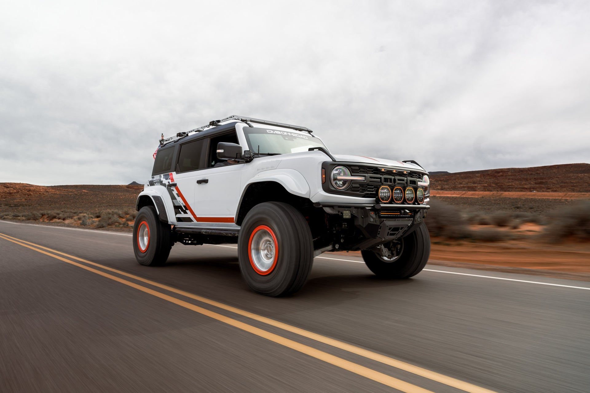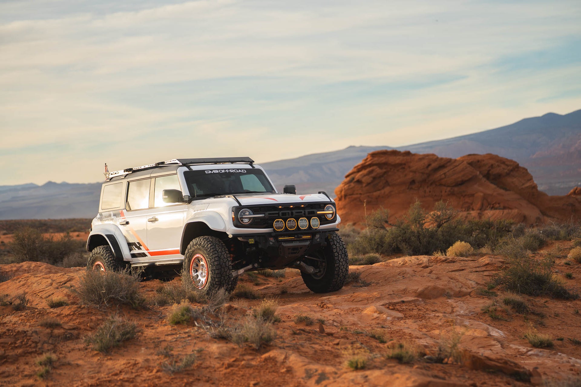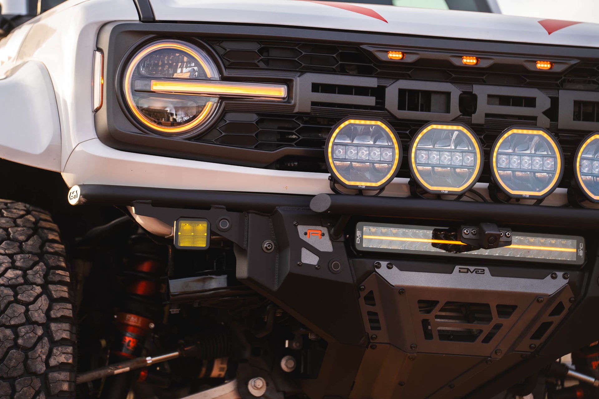 Finished in DV8’s micro-texture black powder coat, the bumper is complemented by gray accent skid plates that highlight its prerunner-inspired design. Additional styling details include CNC-machined logo end caps and a distinctive orange “R” accent panel that ties into the Bronco Raptor’s factory styling cues. The result is a rugged and refined front bumper engineered for serious off-road performance while enhancing the aggressive stance of the Bronco Raptor.