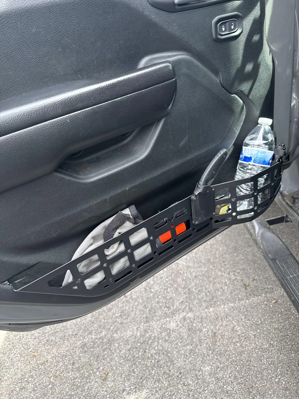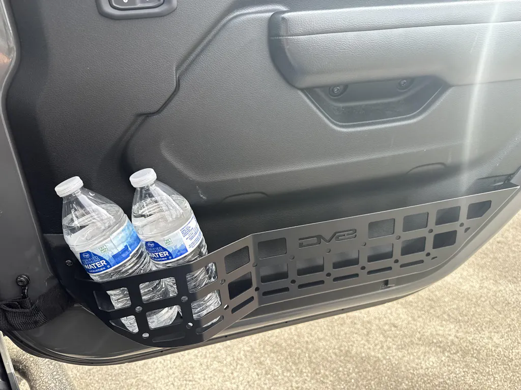 Our Jeep Gladiator & Wrangler Front Door Molle Panel Pockets were designed to replace the weak, saggy OEM door nets. The front panel protrudes outwards to maximize space for a water bottle or similar sized object. The molle panel design allows for multiple gear mounting solutions for things like tools, a pocket knife, a holster, & other daily gear.