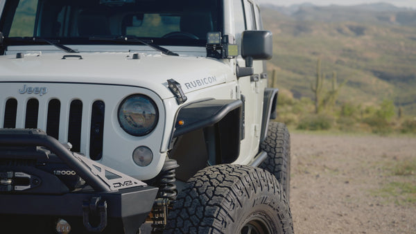 Our Spec Series Jeep JK Fender Flares feature a tube and plate steel construction that offer both protection and style. Their low-profile fitment increases clearance to enable improved axle articulation on the trail. The seam along the edge of the fender and the body is protected by a rubber seal, which also helps prevent the build-up of dust or small rocks.